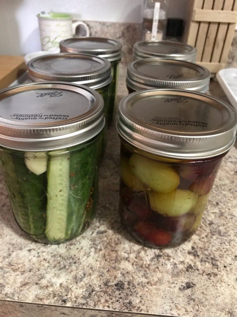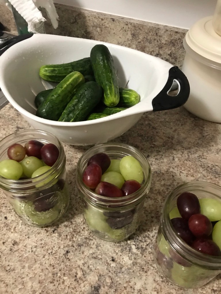 As the grapes and cucumbers sit in their brines for a few days the fermentation involves the water leaving the food items, which dilutes the brine. The acidity is then drawn into whatever’s being pickled and this lowers its pH, which makes it increasingly hostile to harmful bacteria. Now it’s a matter of waiting and giving them time to build flavor. Can’t wait!
